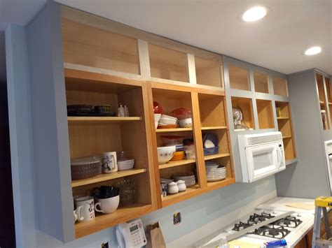 The first step in the process of converting shelves to drawers is to remove the doors from the kitchen cabinet. The plan was to add a bank of cabinets above the existing wall cabinets and then reface the cabinets with solid maple, factory finished in a soft gray. Four popular ways to extend kitchen cabinets to the ceiling are: So.
