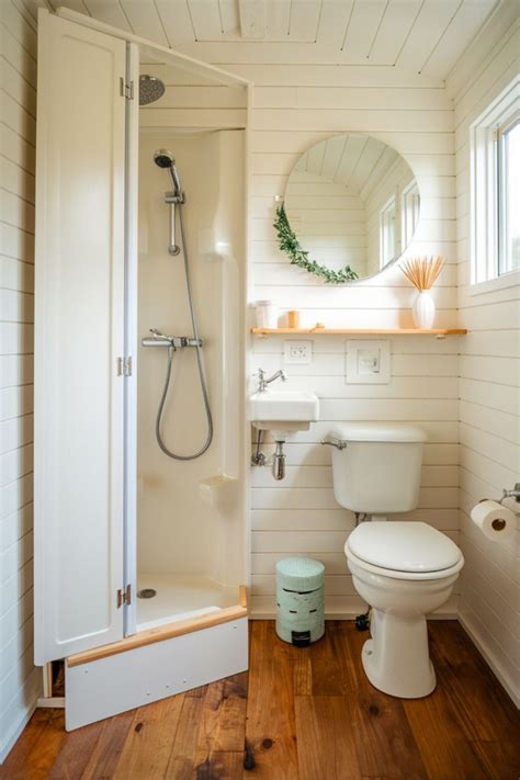 Simple tiny house bathroom with bench toilet, tiny floating sink, window and shower. Installing one large mirror or a collection of smaller mirrors above the unit will reflect the space, and further trick the eye into thinking the room is larger than its actual dimensions. Cloth shower curtains introduce a level of sophistication and glamour to any bathroom. A tiny.