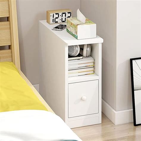 Range of white bedside table and cabinets. If you want a small bedside table but still need lots of storage space, then made's ebro bedside table is a great option. Very slim dorset 17cm narrow white bedside table with 4 drawers for storage. Slim, very narrow, max 20cm wide, cheap, affordable baskets, trunks, unique, with drawers. With a satin painted.