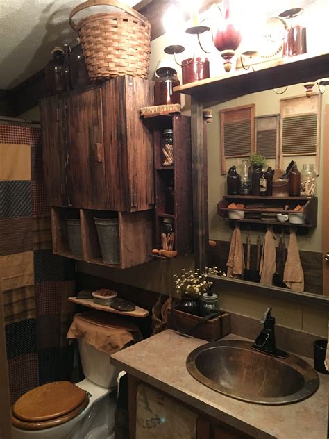 From the articles that i had read, primitive bathroom decor tends to feature a lot of white as a base paint color as well as faded pinks and greens. Primitive crackle painted tan with black star or your color choice primitive star 3pc mason jar bathroom set. The market offers numerous patterns and styles so there is something to match.